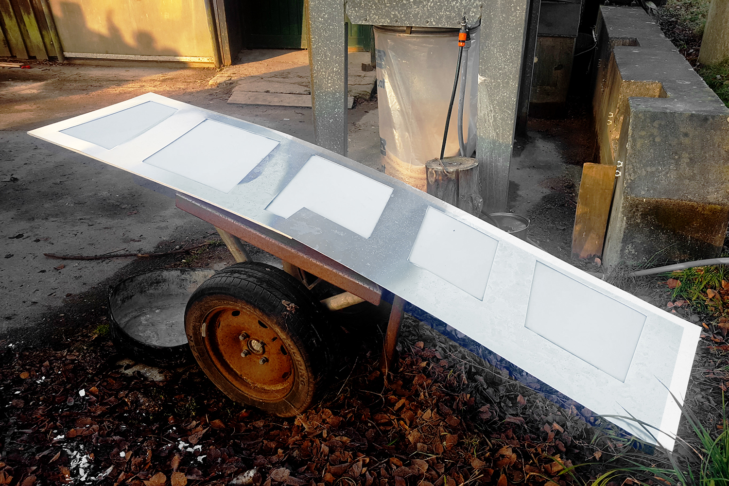 ![]() Prototype of transparaent roof tile exposed to weather for testing, 2017 (Photo by author) |